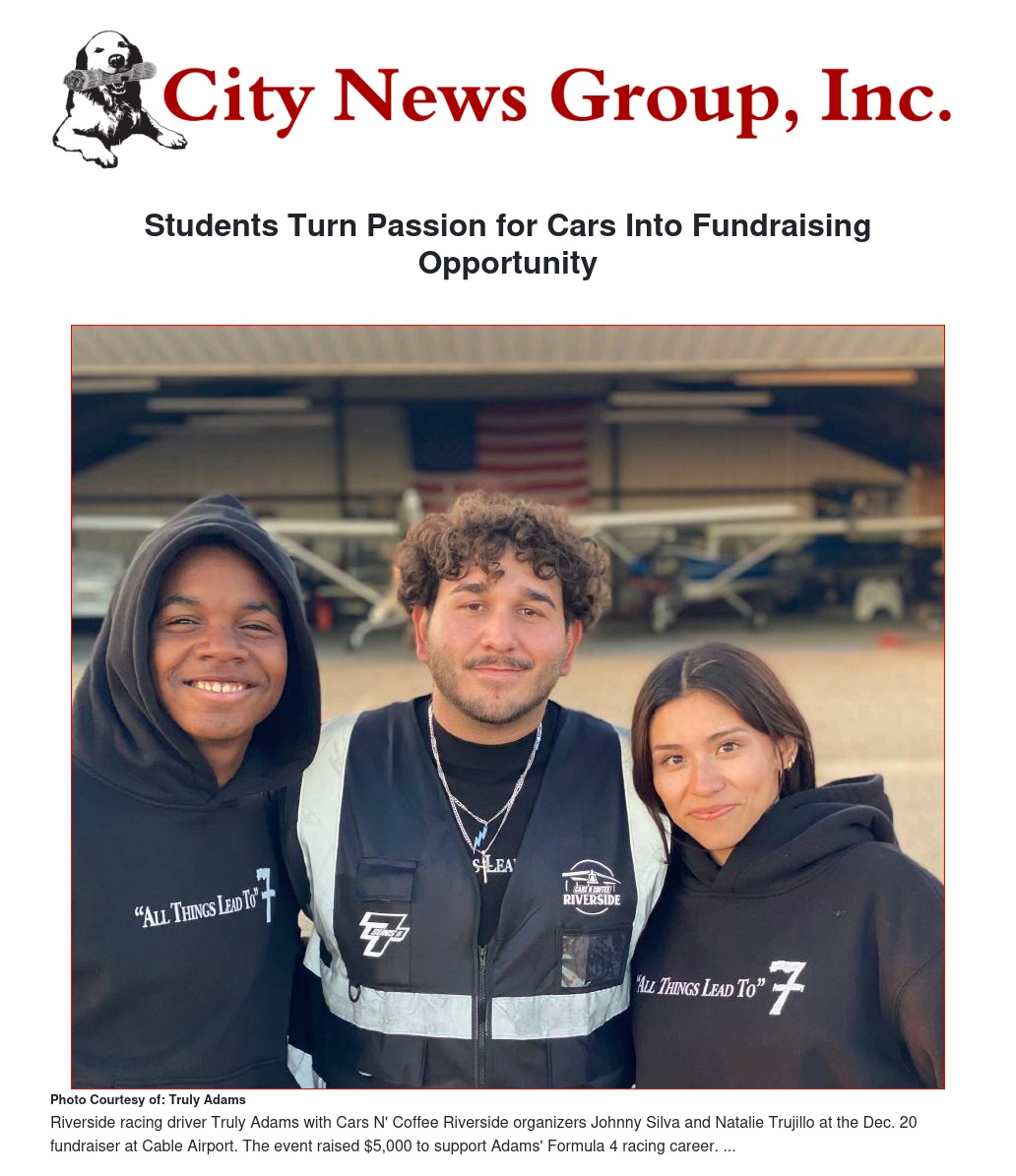 Local college students and Inland Empire car enthusiasts turned a shared passion for automotive culture into tangible support for rising Riverside racing talent Truly Adams, raising $5,000 during a Cars N’ Coffee fundraiser held at Cable Airport.