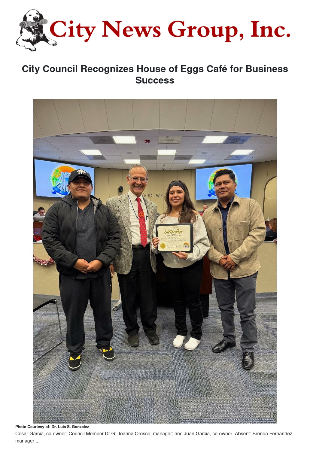 City Council Recognizes House of Eggs Café for Business Success by Dr. Luis S. Gonzalez - City News Group, Inc.