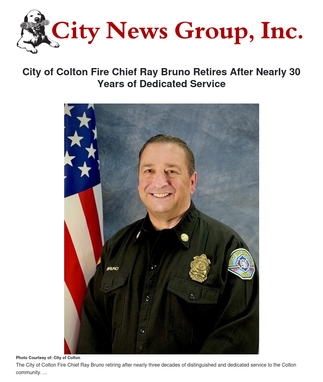 City Manager, Bill Smith stated ““Chief Bruno has given his career to the City of Colton, culminating in his fine leadership as Fire Chief. It has been my honor working alongside him, and I wish him the best in his well-earned retirement.”