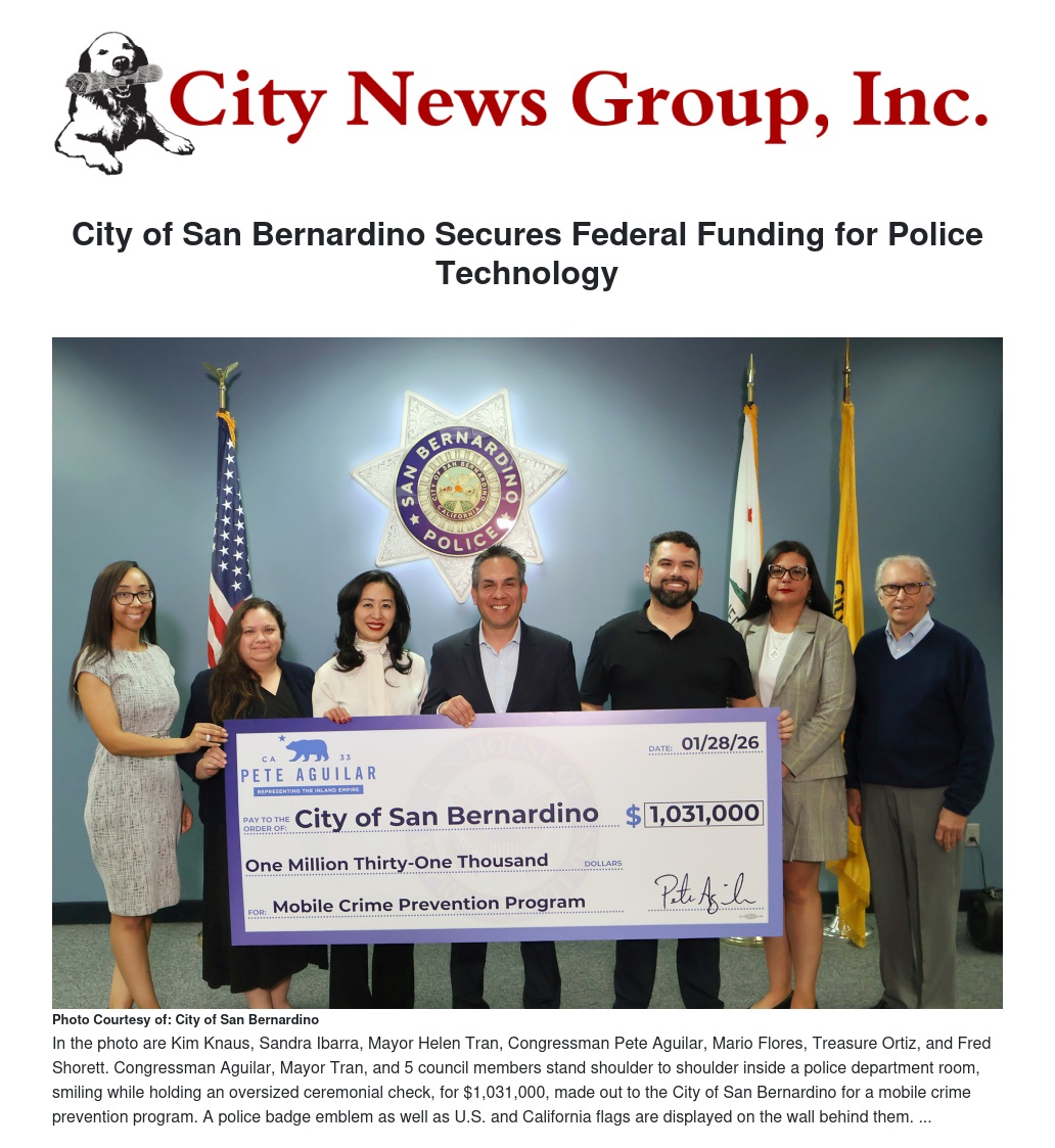 “These funds are more than a line item in a federal budget - they represent safer streets, improved infrastructure, and stronger public services,” added Tran. “Thank you, Congressman Aguilar, for standing with San Bernardino and investing in the safety of our community.