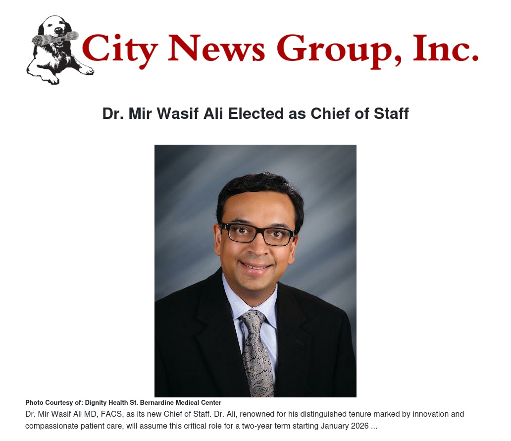 Dignity Health – St. Bernardine Medical Center has announced the election of Mir Wasif Ali, MD, FACS, as its new Chief of Staff. Dr. Ali, renowned for his distinguished tenure marked by innovation and compassionate patient care, will assume this critical role for a two-year term starting January 2026. He will be instrumental in upholding medical staff standards and representing the medical community on the Hospital’s Community Board, shaping the future of patient care.
