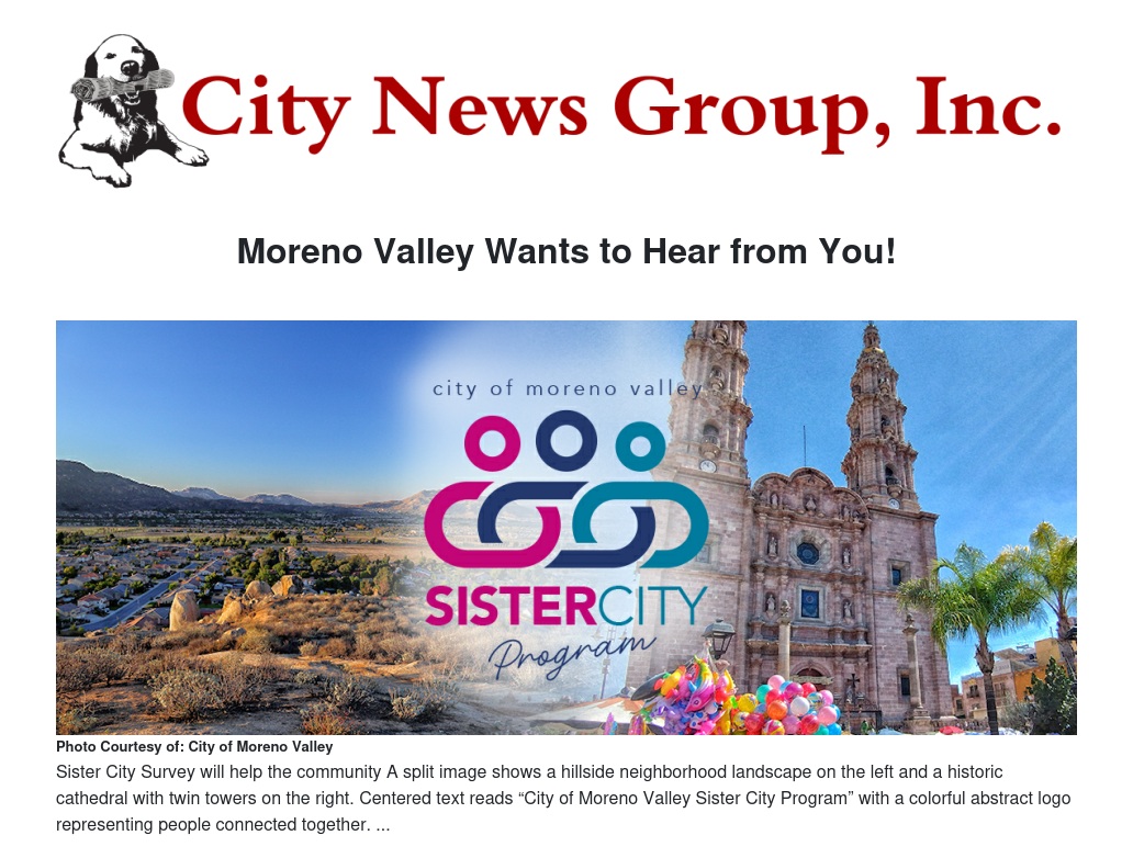 The City of Moreno Valley formed its Sister City partnership with San Juan de los Lagos, Jalisco, Mexico on July 13, 1993, through Resolution No. 93-57. The most recent delegation from San Juan de los Lagos visited in February 2023. Since the COVID-19 pandemic, the program has been mostly inactive, though it has traditionally been supported by local community and cultural organizations.