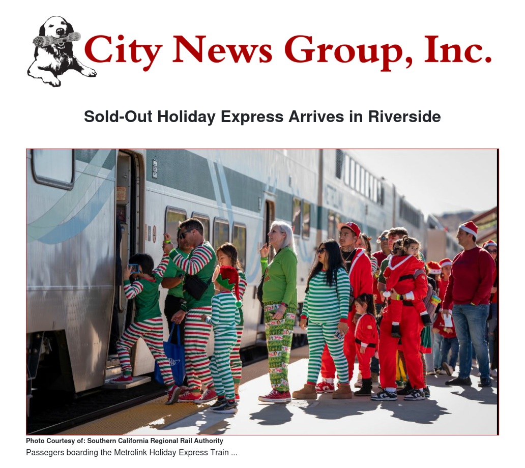 Metrolink’s 2025 Holiday Express event series will be rolling through Riverside this Saturday, Dec. 20. The Holiday Express is a specially ticketed experience aboard a festively decorated train set with carolers, beloved holiday characters and special guests. Passengers are also treated to a welcome event at the station with family-friendly activities and entertainment ahead of boarding. The five-county tour kicked off in Los Angeles on Saturday, Dec. 6, and has already included stops in San Bernardino and Irvine. The final tour date will be in Simi Valley on Sunday, Dec. 21.