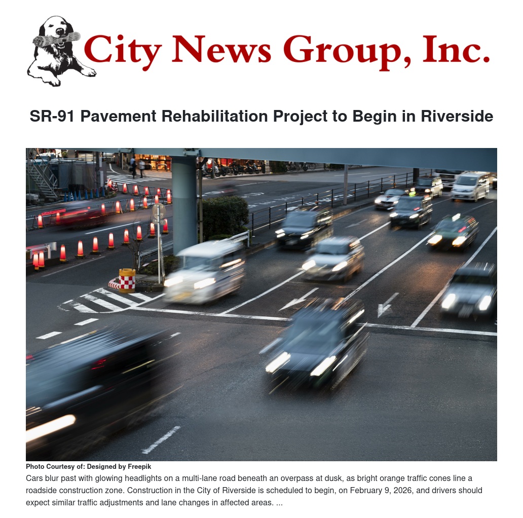 Riverside County, CA -- First District, Riverside County Supervisor, José Medina, is notifying residents of an upcoming Caltrans pavement rehabilitation project, on State Route 91, in the City of Riverside. Construction began in February, spanning from just west of Van Buren Boulevard to just east of Madison Street, with work expected to continue through summer 2027.