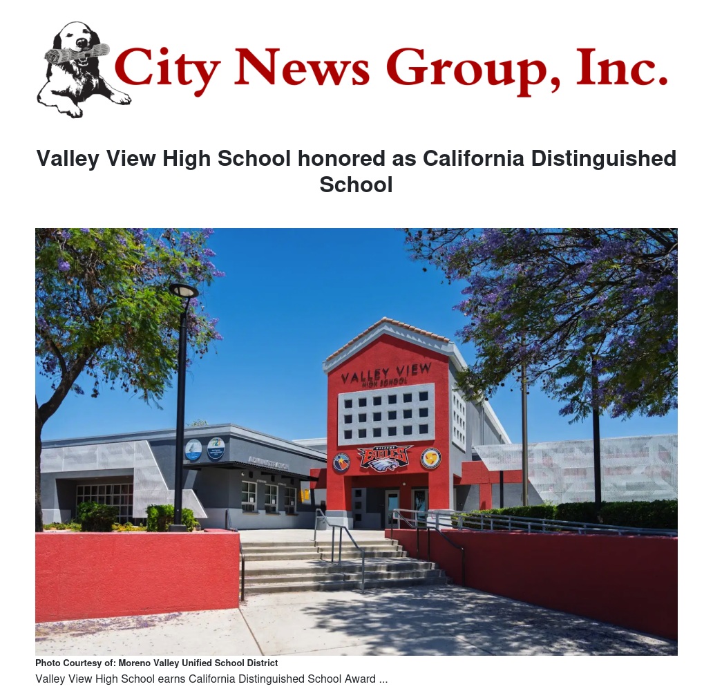State Superintendent of Public Instruction, Tony Thurmond, announced on March 10, 2026, that Valley View High School is one of the 408 middle and high schools selected to be honored under the 2026 California Distinguished Schools Award Program. This award program recognizes schools for closing the achievement gap and those demonstrating exceptional student performance.