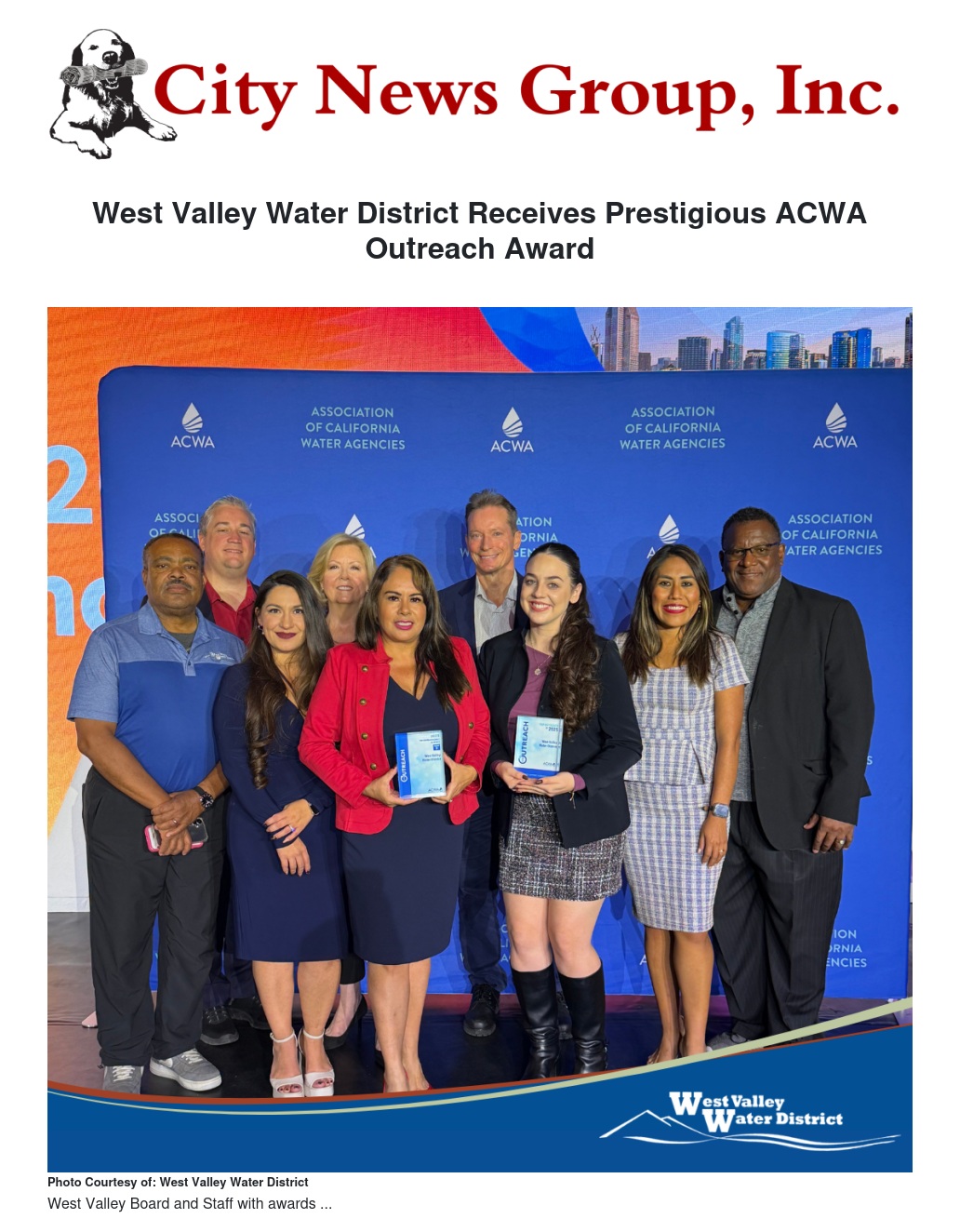 West Valley Water District (WVWD) is proud to announce it has been selected as the winner of the 2025 Overall Outreach Award presented by the Association of California Water Agencies (ACWA). This honor, which is awarded to just one agency among almost 500 member agencies statewide, demonstrates exceptional leadership and involvement in advancing ACWA’s legislative and regulatory priorities.